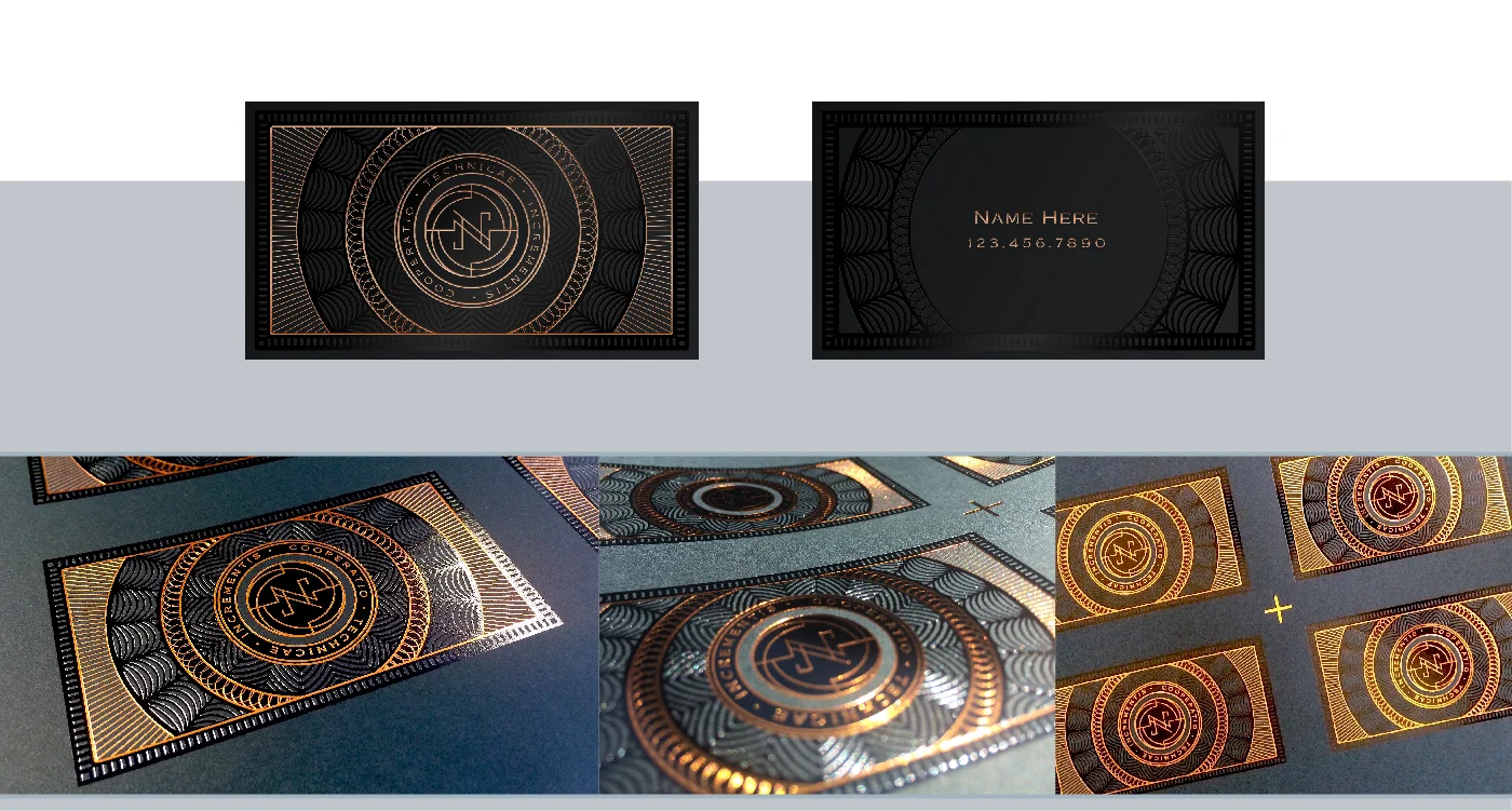 In addition to the metal membership card, we also created business cards for Nucleus. These are "printed" on black paper using copper and black foil.