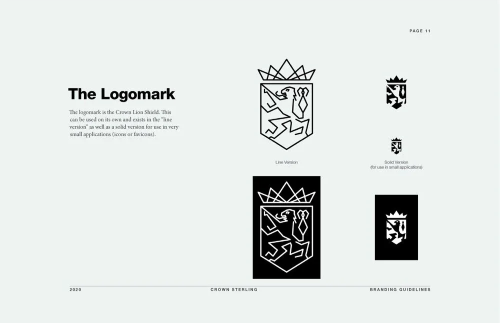 Crown Sterling received a full brand redesign from the ground up, starting with the logo. The previous company featured a heraldic lion, however this was very similar to their parent company and also failed to convey the cryptography space in which the brand resides. The new logo still features the lion, but also now includes both a crown and a shield.